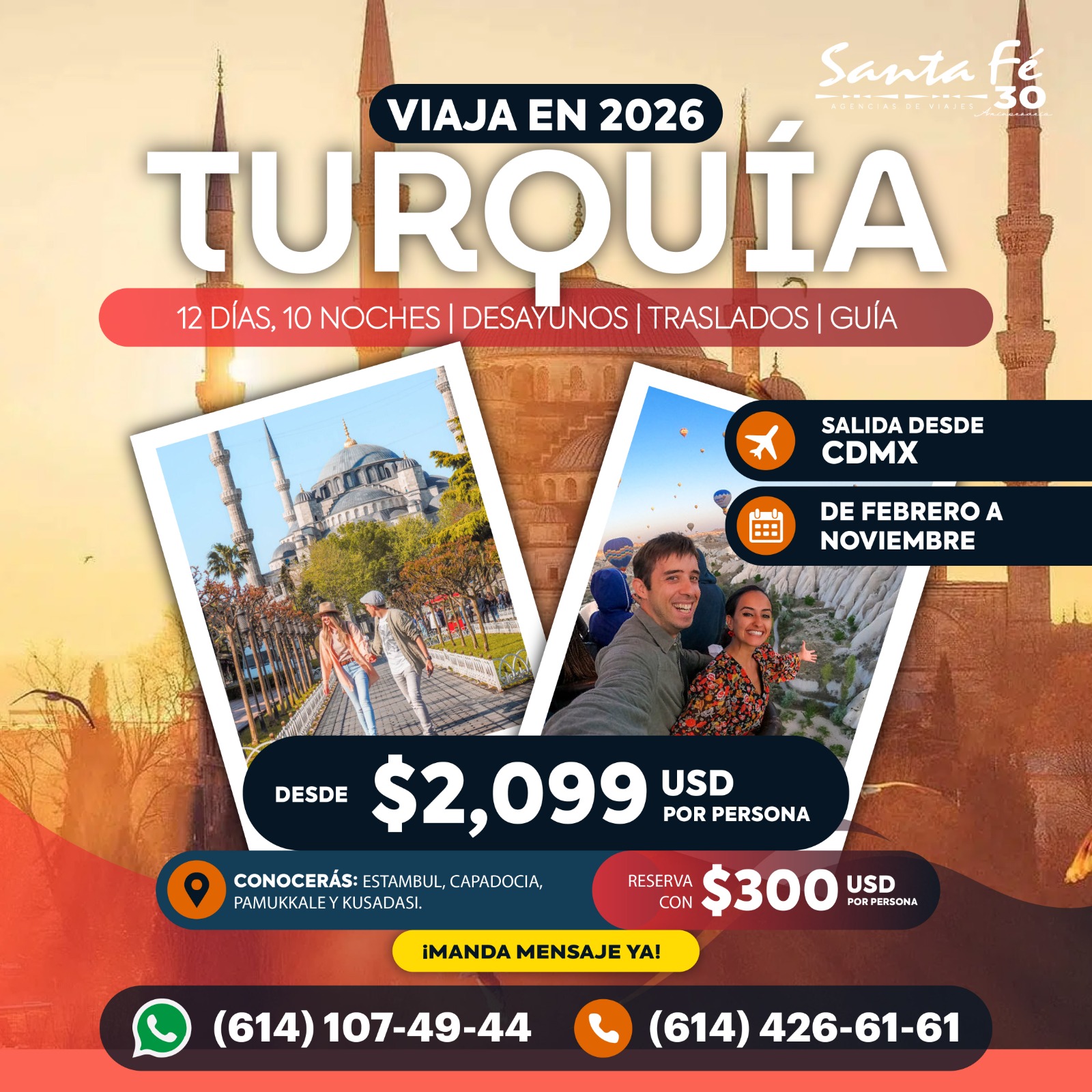 ✈️ Incluye vuelo redondo desde Chihuahua o Cd. Juárez, traslados, hospedaje céntrico, tours y paseos.